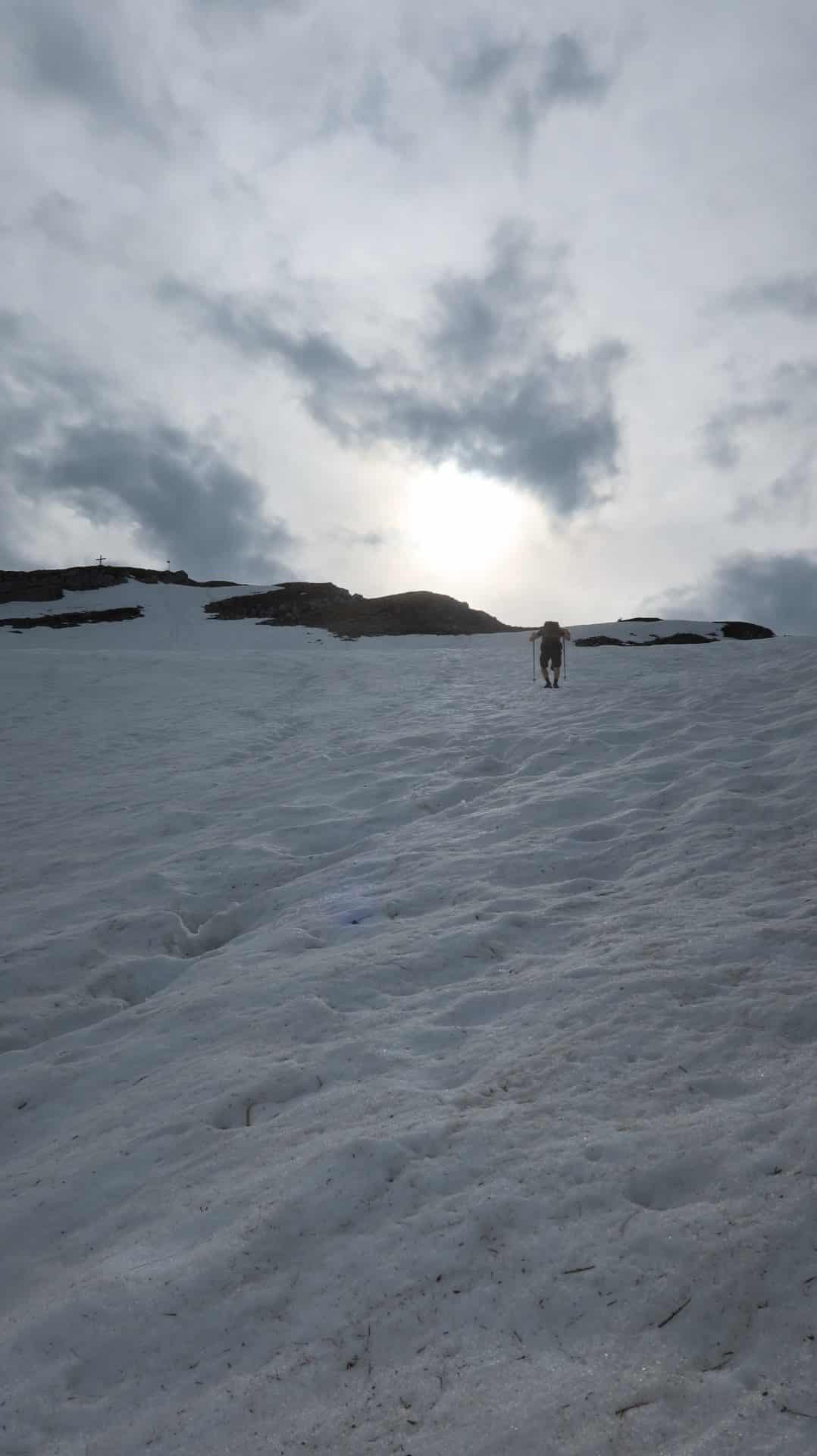 Weiter dem Grat entlang war uns zu riskant. Immerhin warten zuhause Frau und Kinder. So sind wir abgestiegen und dann von unten wieder hoch Richtung Hengst grösstenteils durch Schnee. Der Schnee war zum Glück relativ hart, aber leichte Trekking Schuhe waren vielleicht doch nicht ganz passend. Ich wünschte ich hätte noch das Snowboard dabei. Die Abfahrt wäre gar nicht so schlecht gewesen 😉