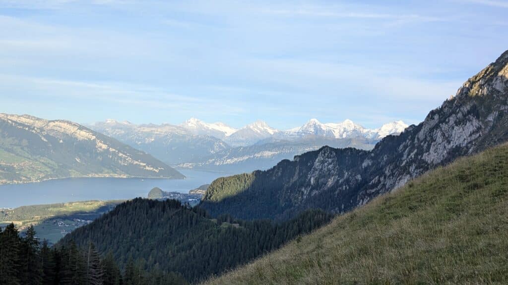 Nach knapp zwei Stunden stehe ich oben. Gipfel erreicht. Vor mir die gläserne Aussichtsplattform – unter mir der Thunersee, weit vorne das Mittelland und am Horizont die Jurakette. Im Rücken die imposanten Viertausender, die im orangen Abendlicht der Sonne glühen. Und dann: perfektes Timing. Die Sonne senkt sich langsam im Westen, färbt Himmel und Berge rot und verschwindet schliesslich hinter den Gipfeln. Ich gönne mir ein paar Minuten, ein paar Bissen Energie – und einfach diesen Moment.